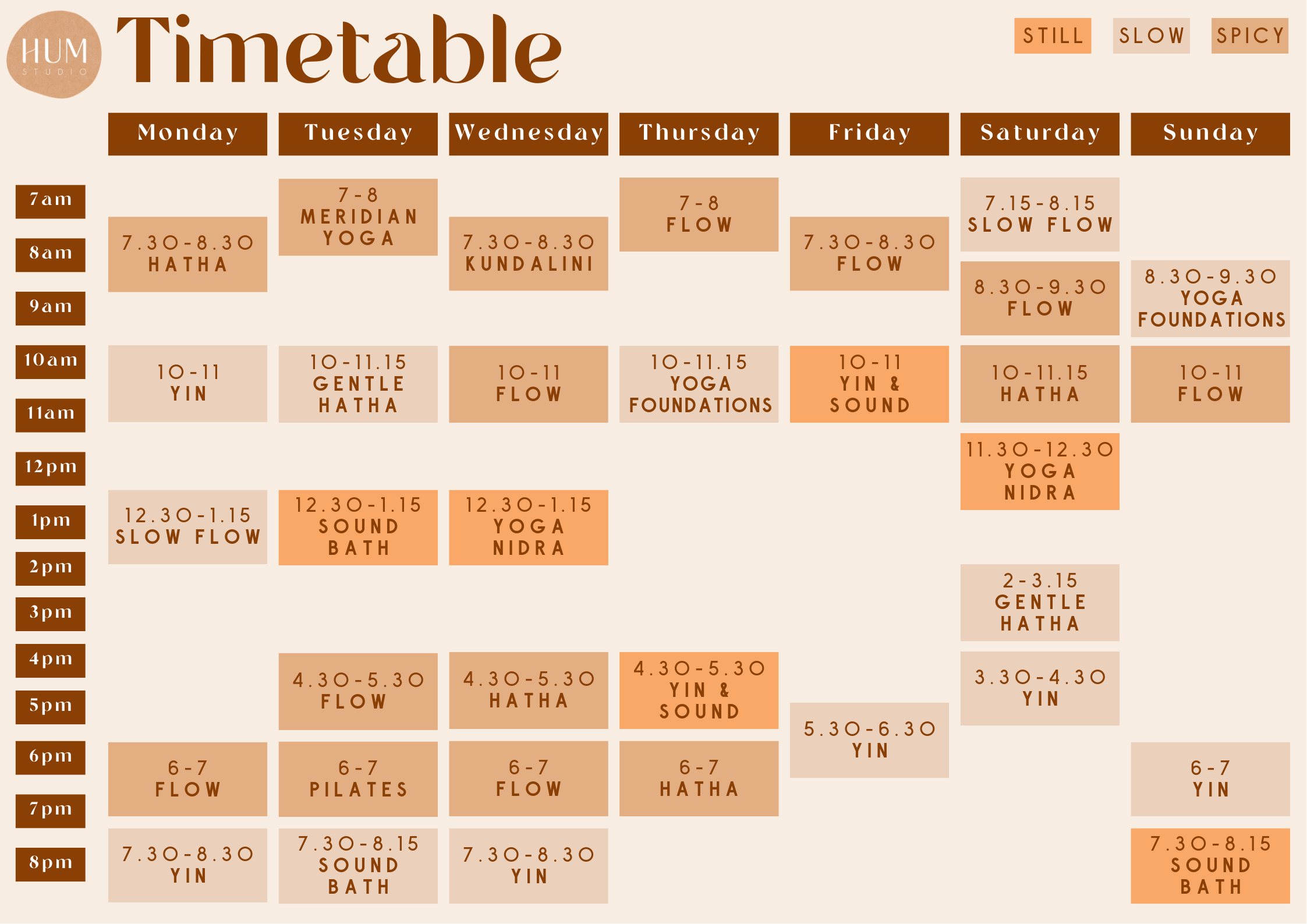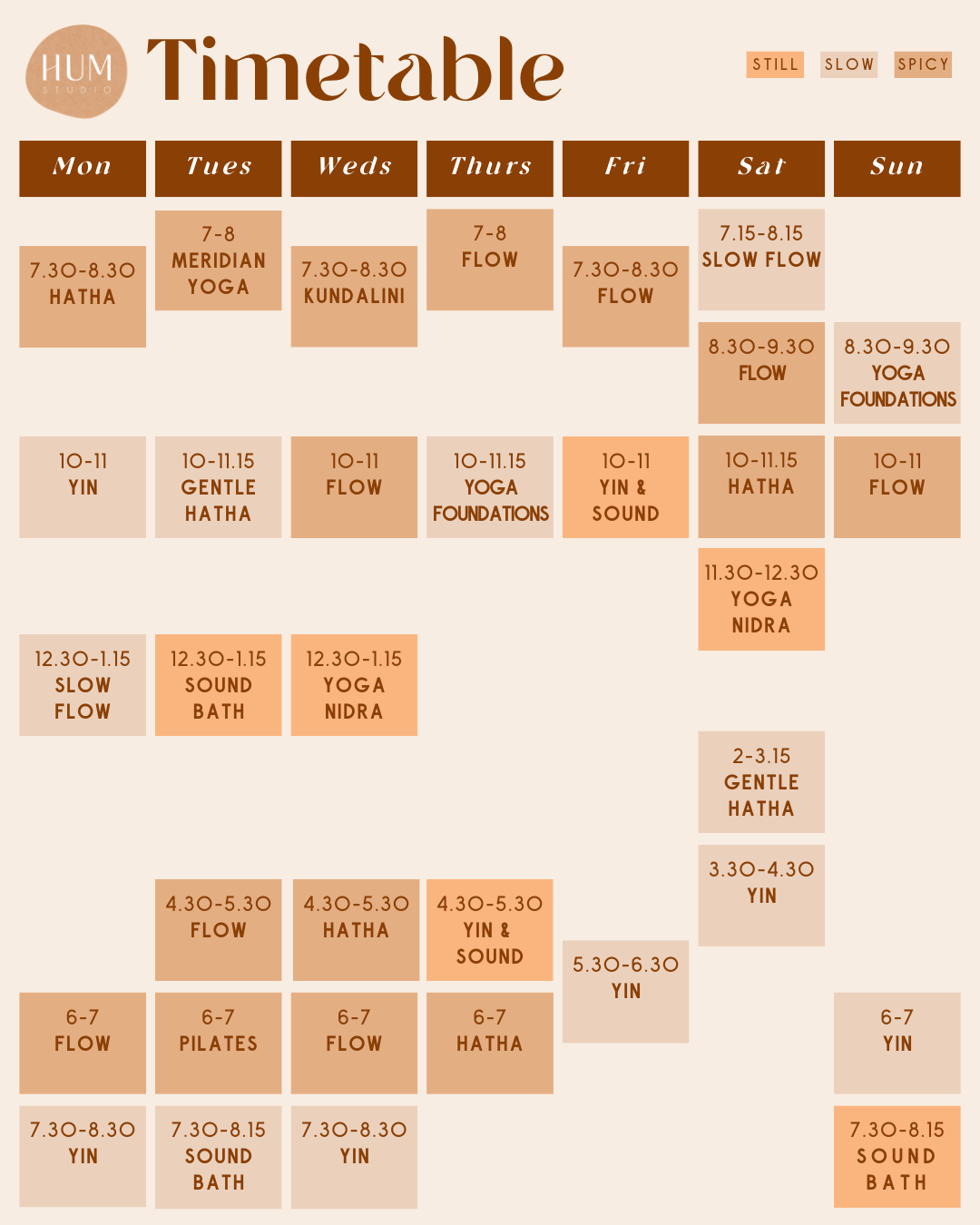 Our timetable is colour coded so you can easily see which classes are Still, Slow and Spicy. Still classes are perfect for when you wish to quiet the mind and focus inward, Slow are for cultivating a mind-body connection, and Spicy are for increasing strength and building inner fire.